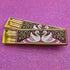 Two swans facing each other, their graceful necks forming a gentle heart shape. Nestled around them are plump, ripe strawberries hanging from curling green vines. This matchbox design exudes a delicate tenderness and features fuchsia foil highlights.