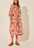 Lightweight midi dress white pink and orange floral print on nude blush background. Empire line skirt and bowknot tie at neck. Non elasticated cuff to sleeves