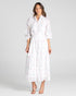 The midi dress is a lined button through dress with a separate fabric tie waist, and a drop waist seamline.