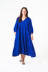 Slay all day in this dress that's both chic and comfortable. The oversized design features tie strings for a customizable fit and a v-neckline. The billowing 3/4 sleeves with elastic cuffs add a touch of feminine flair, while the button front detail and on-seam hip pockets keep things practical. Show off some serious style with the tiered flounce skirt and border print at the front york, sleeves, and hem. Who says fashion can't be functional too?