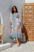 The Mexico Baha Dress by Joop & Gypsy the label features a V-neckline, 3/4 sleeves with elasticated cuffs, drawstring underneath the bust, side seam pockets and is a maxi length.