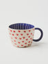 A hidden "Sweet Heart" message awaits at the bottom of the indigo-striped interior of this Chino mug, offering a moment of unexpected joy with your final sip. The exterior is dotted with hand painted red love hearts, creating a sweet pattern. Each piece is shaped from durable earthenware by skilled Vietnamese craftspeople working from our Sydney designs, the deep blue stripes and hearts applied by hand with practiced precision.