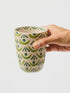 Delicate patterns reminiscent of Mediterranean gardens encircle this artisan-crafted cup, its geometric precision balancing the organic forms of nature. Hand-painted in our distinctive green and white palette, each sip becomes a sensory journey the cup's substantial size making it perfect for coffee and tea or spritzes and cocktails.