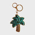 Fabric padded palm tree key chain with green sequin and bead detail. Gold hardware
