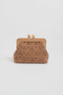 The Tara Diamond Weave Timber Clutch in Camel features a timber frame and clasp with diamond weave detailing, a magnetic closure, and an optional vegan leather strap.