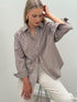Chocolate brown and white stripe button down shirt with collar, rounded hem and feature gathering at rear neck to create a looser fit through the back.
