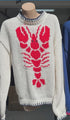 White sweater with large red lobster to front. Features black stitching at neckline. Wide sleeve with cuff at wrist.