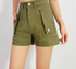 Khaki colour stretch denim shorts with feature fold-over pockets and zipand button closure