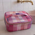 Our Large Pink Toiletry Bag is crafted from textured vegan leather and features gold accent zippers, an internal zipped pocket, custom printed lining, and a convenient handle for effortless carrying.