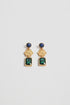 The Royale Coin Centre Event Earrings (Blue) are drop earrings featuring an emerald square stone and coin detailing with diamantes. Secured with a stud back closure and crafted from stone, diamante, and plated metal.