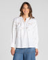 The Boom Shankar Nyra Embroidered Top is a go-to summer style with its crisp white cotton, floral embroidery and cut out details. This lovely design features a button-up v neckline with gathering around the collar.